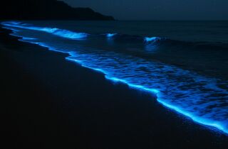À noite, ondas azuis iluminam a areia e transformam o litoral brasileiro em um espetáculo natural que parece saído de um sonho