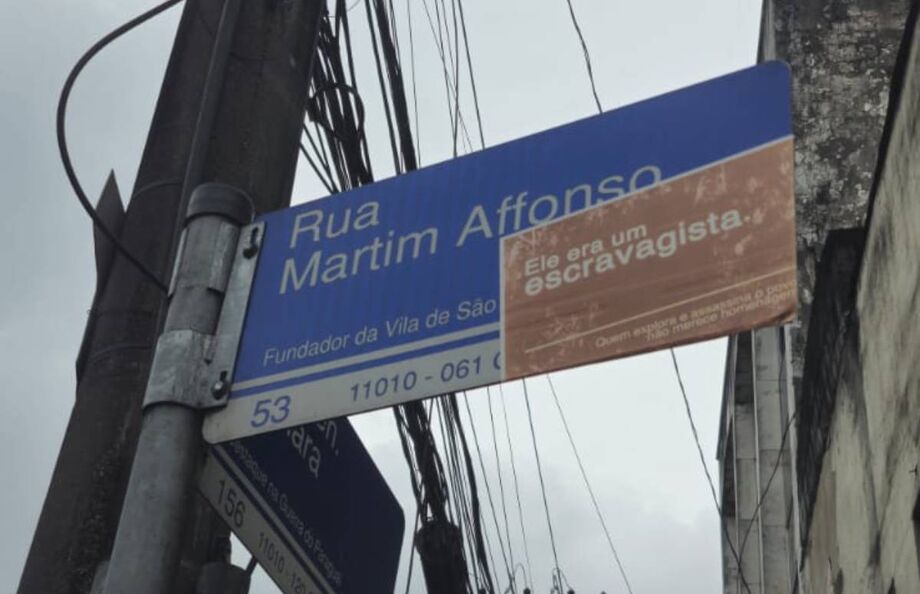 “A colagem na placa de rua faz todo o sentido histórico. Quando a gente pensa que todo empreendimento português, desde o início, é baseado na mão de obra escravizada”, afirma.