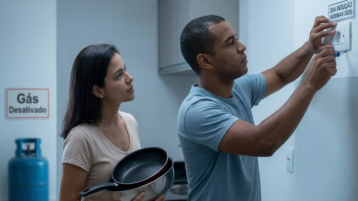 Imagem conceitual mostra moradores de um novo prédio no litoral de SP adaptando a fiação para o fogão de indução - IA/Diário do LitoralSe você está saindo de uma casa para um prédio novo, vale checar a fiação. O fogão de indução exige uma tomada específica e panelas que aceitem o magnetismo.