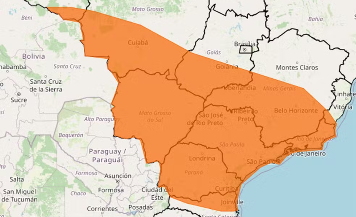 O aviso inclui todo o Mato Grosso do Sul e o Rio de Janeiro, além de áreas de Mato Grosso, Goiás, Minas Gerais, São Paulo, Paraná, Santa Catarina, o extremo leste de Rondônia e parte do Espírito Santo.