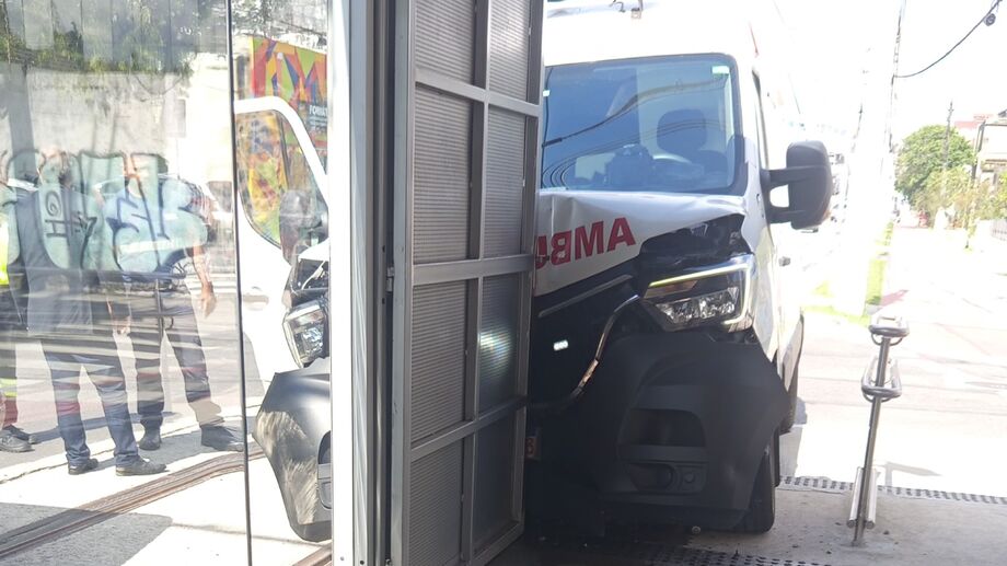 Uma ambulância colidiu contra a estrutura da estação do Veículo Leve sobre Trilhos (VLT) localizada em frente ao Poupatempo, na Rua João Pessoa, no Centro de Santos, na tarde desta terça-feira (3).