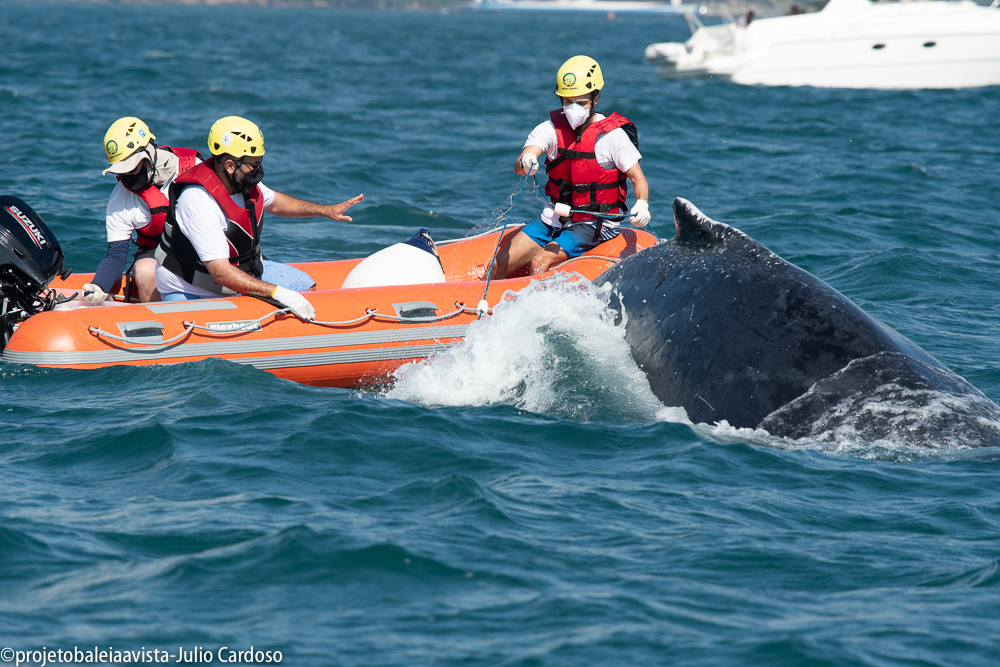 A equipe do Instituto Argonauta sediada em São Sebastião e coordenada pelo biólogo Manuel da Cruz Albaladejo, com o Biólogo Marcelo Rezende e o Oceanógrafo Victor Bellomo, deslocou-se até o local onde confirmaram que o animal estava envolto por uma rede de pesca.