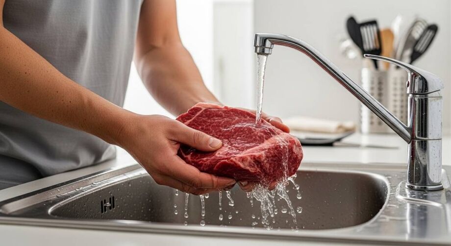 Em alguns casos, a prática é contraindicada, já que respingos de água podem disseminar bactérias patogênicas, como Salmonella e Campylobacter, contaminando utensílios e outros alimentos próximos.