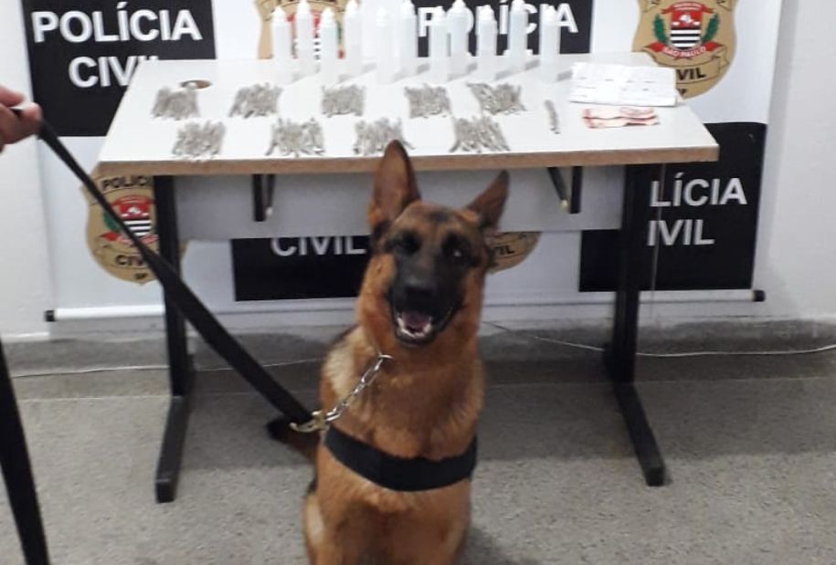 Com orientação de um agente, a K-9 Ágatha utilizou a técnica de faro e localizou 92 cigarros de uma substância esverdeada, supostamente maconha, 11 frascos plásticos, supostamente contendo lança perfume, R$ 20 em espécie e mais um papel com anotações de contabilidade, possivelmente de tráfico.