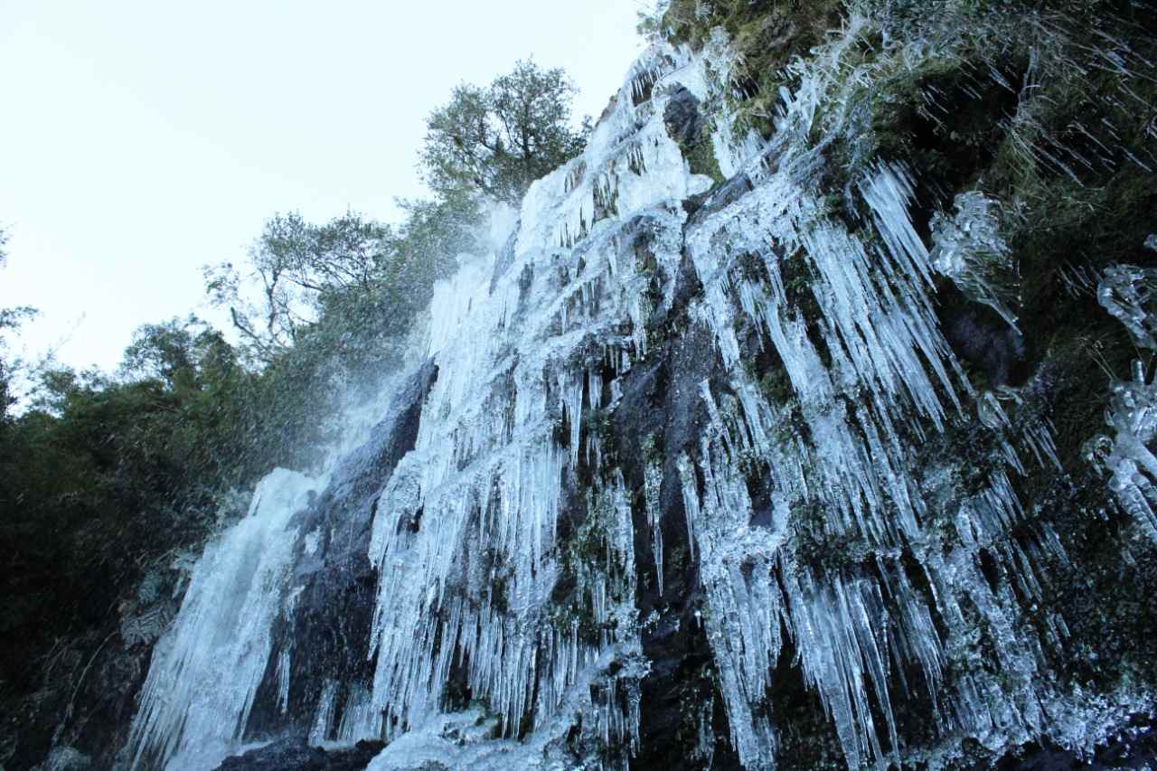 No topo do Morro das Torres, uma cascata congela no auge do inverno e se transforma em uma verdadeira escultura de gelo ao ar livre — uma cena rara e encantadora.