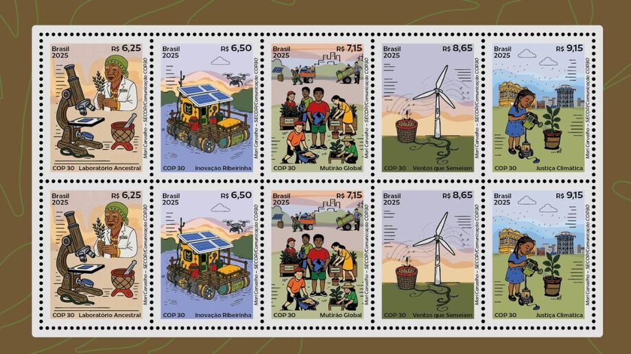 Os Correios apresentaram na quinta-feira (13) a uma série de selos especiais com a temática de COP 30, a 30ª Conferência das Nações Unidas sobre Mudança do Clima", realizada em Belém, no Pará.