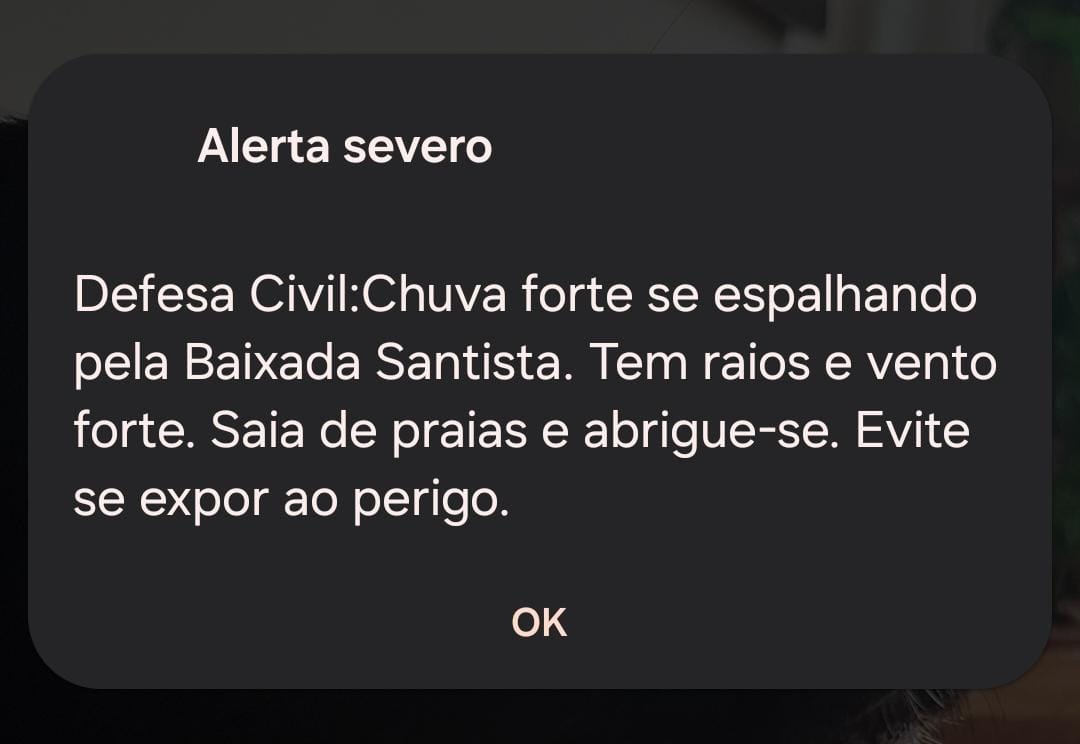 O alerta foi recebido nos aparelhos celulares de Santos, São Vicente, Guarujá e de várias cidades do litoral de São Paulo.