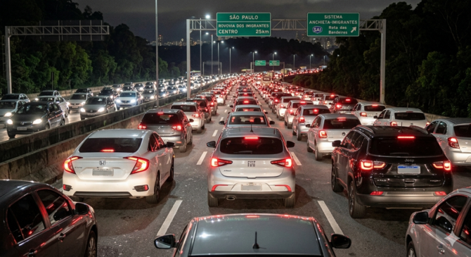 De acordo com a concessionária Ecovias Imigrantes, a operação 2×5 está em vigor na pista sul da Rodovia dos Imigrantes, estratégia utilizada para organizar o fluxo em períodos de maior movimento.