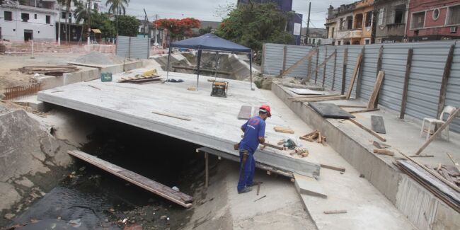 Nesta etapa, estão sendo instaladas dez lajes de 11,95m que formarão o novo pontilhão