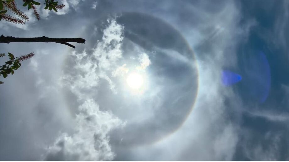 De acordo com especialistas, o halo solar se forma quando os raios solares atravessam nuvens compostas por cristais de gelo, que possuem a capacidade de fracionar a luz e revelar os diferentes espectros de cores do arco-íris em formato circular ao redor do sol.