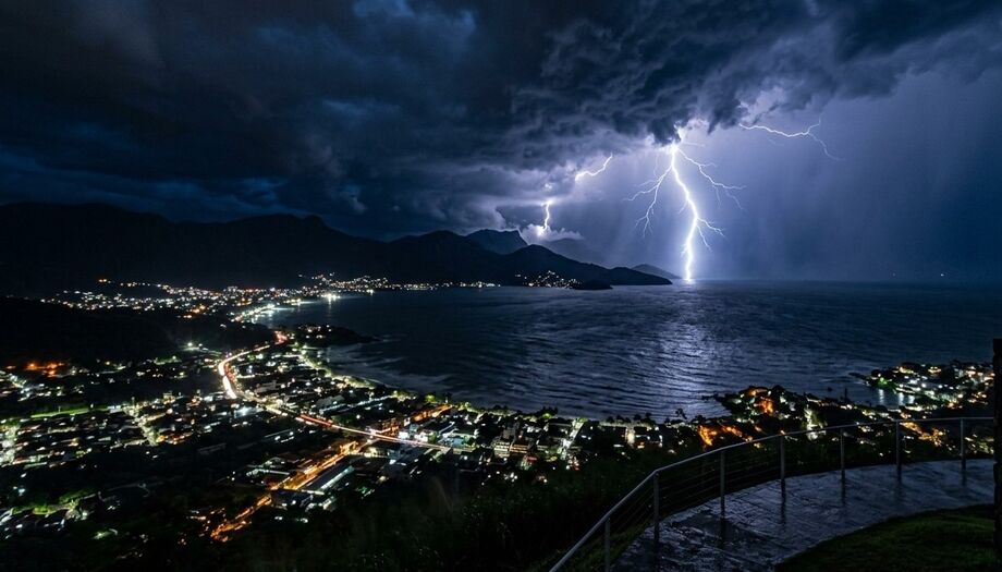 Frente fria chegando durante a madrugada no litoral de SP com muitos raios / Imagem ilustrativa criada com IA/Gemini