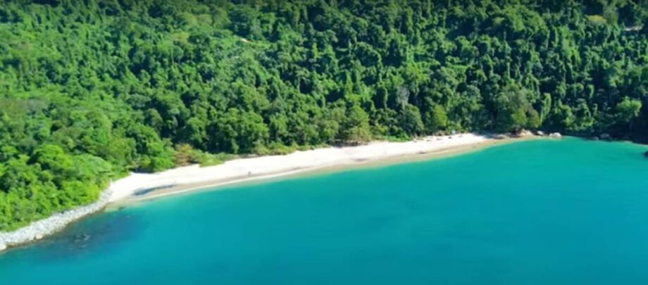 O cenário natural também impressiona. A faixa de areia é envolvida por uma vegetação densa e intensamente verde, criando um contraste marcante com o mar