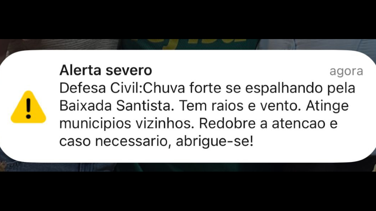 Reprodução/DLA mensagem, enviada por meio de SMS e aplicativos de alerta, destaca uma chuva forte se espalhando pela Baixada Santista, com a presença de raios e ventos fortes.