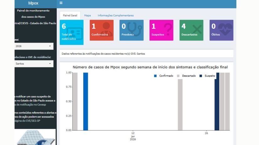 O Estado de São Paulo registrou durante os dois primeiros meses de 2026, 44 casos confirmados de Mpox, com dois deles em Santos. Segundo informações do Núcleo de Informações Estratégicas de Saúde (NIES), 183 casos foram notificados, com 44 sendo confirmados e 69 suspeitos.