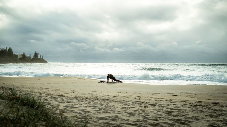 Surfista faz aquecimento na praia com mudança no tempo se aproximando ao fundo / Foto de Nate Biddle/Pexels
