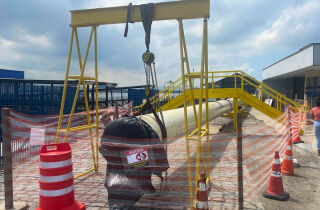 Trecho de adutora que ficará submerso começa a ser posicionado no cais do Porto