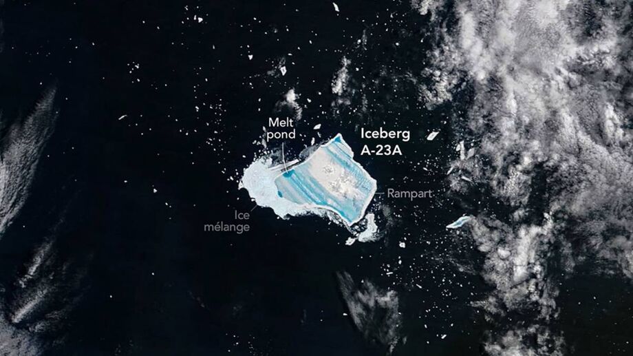 A Nasa divulgou na última quinta-feira (8) uma imagem do maior iceberg do mundo, o A-23A, que está prestes a entrar em colapso. Ele se encontra no Oceano Atlântico Sul, entre o leste do continente sul-americano e as ilhas da Geórgia do Sul.