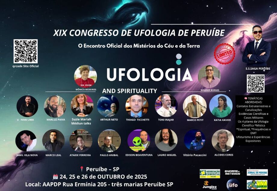 Nos dias 24, 25 e 26 de outubro, Peruíbe será o palco das discussões sobre os grandes mistérios do universo com a realização do XIX Congresso de Ufologia. Este evento, que já se consolidou como referência nacional e internacional, terá como tema central "Ufologia and Spirituality" (Ufologia e Espiritualidade), abordando uma vasta gama de tópicos que envolvem os fenômenos extraterrestres, a ciência por trás dos contatos, espiritualidade e experiências transformadoras.