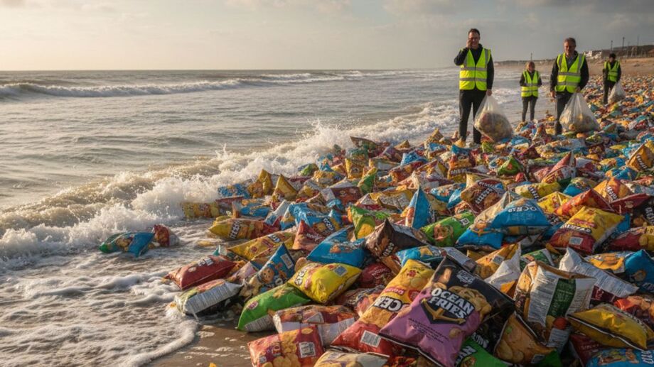Os moradores do litoral sul da Inglaterra foram surpreendidos por um cenário digno de filme surrealista. Milhares de pacotes de batatas fritas e cebolas foram levados pela correnteza até a areia, cobrindo a praia em uma extensão que ia "até onde a vista alcança". O fenômeno bizarro, ocorrido após a queda de contêineres de carga no oceano, transformou o paraíso natural em um depósito de salgadinhos a céu aberto.