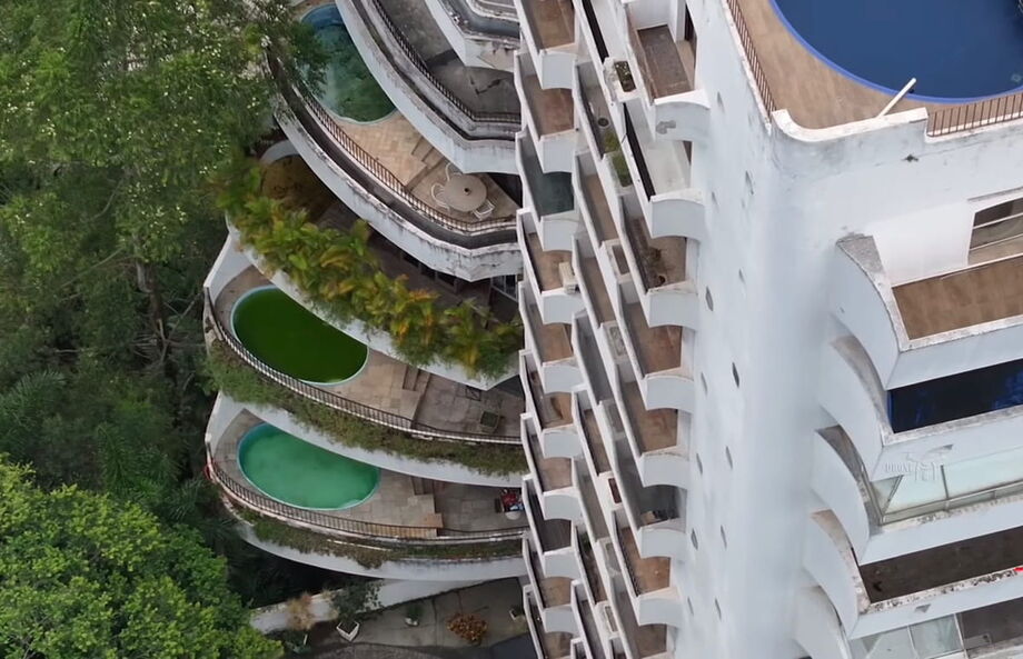 No Penthouse, a paisagem de varandas quebradas, piscinas vazias e vegetação tomando as sacadas contrasta com os salões generosos que um dia receberam empresários, banqueiros e artistas.
