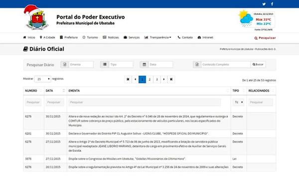 Em 2006, a Câmara de Ubatuba aprovou a lei 2853 que obriga a prefeitura a disponibilizar em seu site a íntegra do “Diário Oficial” do município. A existência também de uma versão digital facilita o acesso à informação pública, mas a Administração ainda não cumpre a lei proposta há 11 anos pelo vereador Jairo dos Santos, do PT, e promulgada quando Ricardo Côrtes, hoje vereador eleito pelo PSC, era presidente da Câmara e pertencia ao PV.