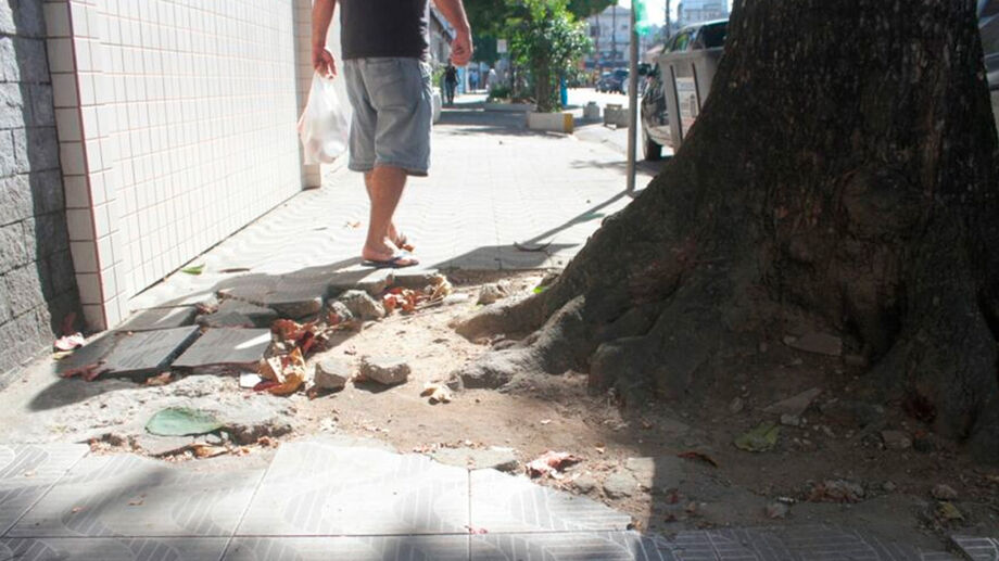 Moradores de Santos frequentemente enfrentam um problema comum nas ruas da cidade: raízes de árvores que levantam ou quebram as calçadas, dificultando a circulação de pedestres / Nair Bueno/DL