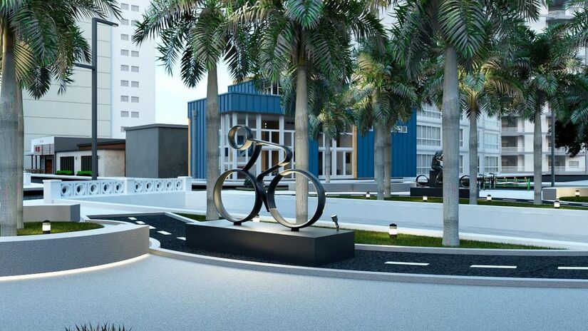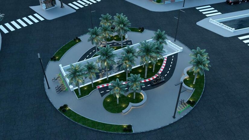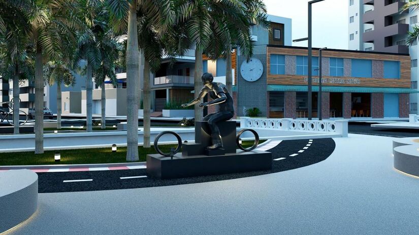 As esculturas alusivas ao motociclismo ficarão sobre uma faixa de asfalto preto, com sinalização de solo arrematada por faixa zebrada, simulando uma pista, em um total de 68m².