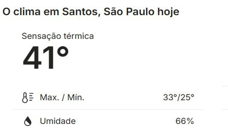 Dados do The Weather Channel consultados na tarde desta sexta (26) indicam que o calor em Santos superou o do Rio de Janeiro. A sensação térmica na cidade do eterno Pelé chegou aos 41ºC às 14h, enquanto na Cidade Maravilhosa ela era de 36ºC no mesmo horário.