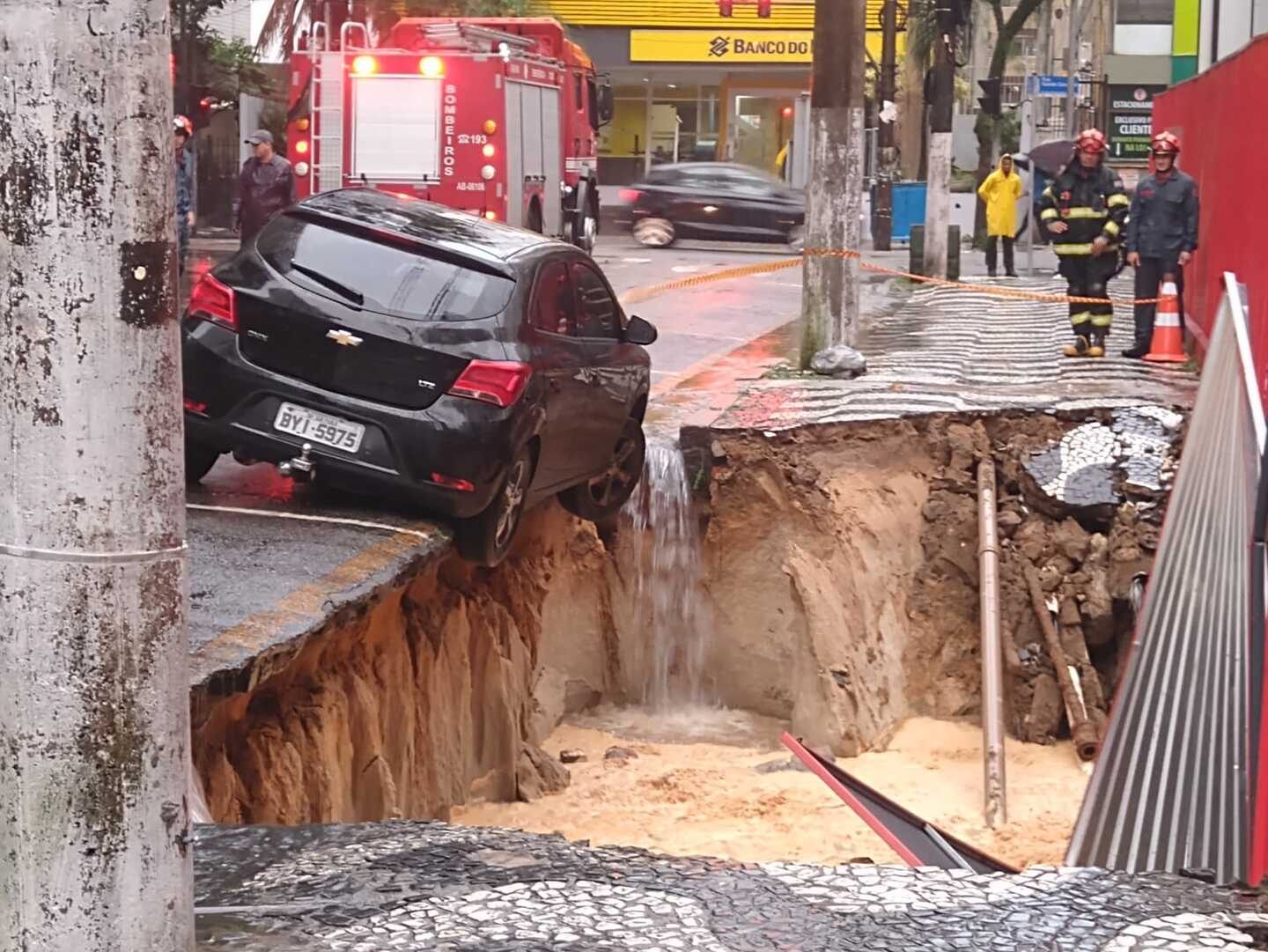 A calçada de um prédio em construção cedeu, entre as ruas Carlos Affonseca e Galeão Carvalhal, no Gonzaga, em Santos, e um carro caiu parcialmente em uma cratera que se abriu com a chuva desta quarta-feira (23). Os bombeiros se encontram no local e não há registro de feridos.