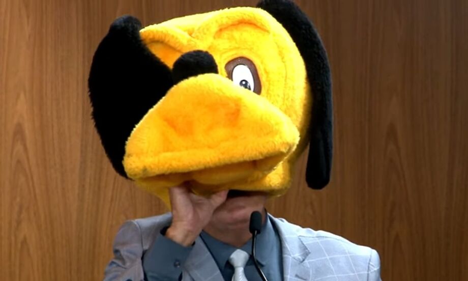 Logo após, ele enfatiza “se for meia boca, nós somos mesmo uns Patetas”, colocando a cabeça do personagem Pluto na cabeça.
