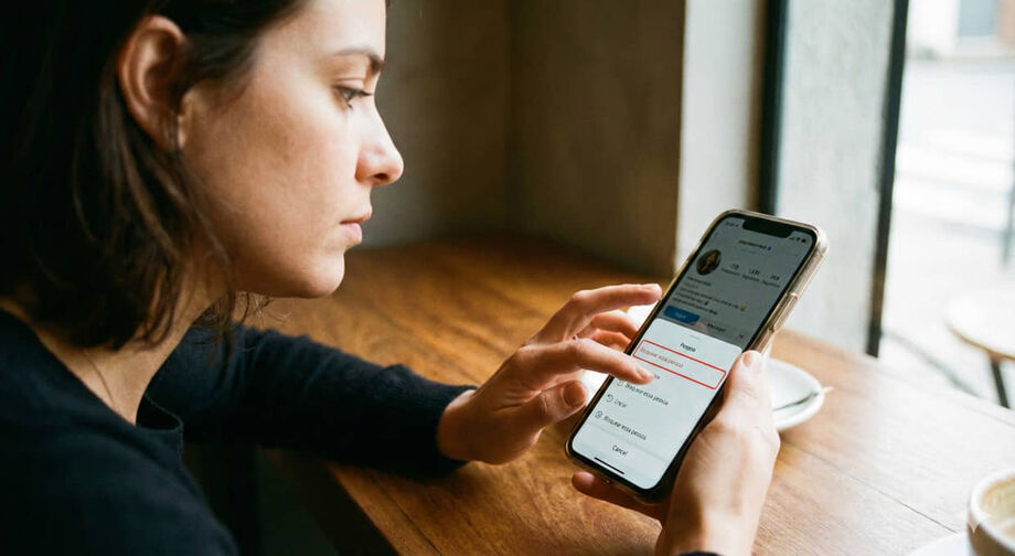 Mulher visualiza perfil do ex na rede social e vai na opção "bloquear", assim como diz a ciência / Imagem ilustrativa / Gemini