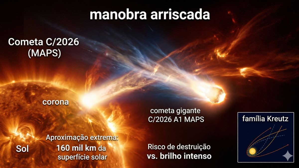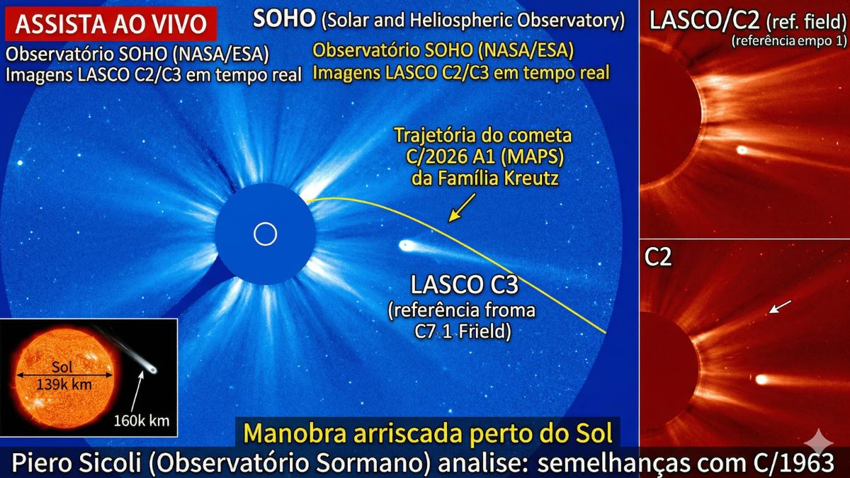 Eles detectaram um cometa até então desconhecido que, sob condições específicas, poderia ser visto a olho nu. Além disso, esse cometa, denominado de C/2026, terá uma passagem tão próxima do Sol neste sábado (4/4), que já se enquadra na categoria dos “sungrazers”, isto é, rasantes ao Sol.