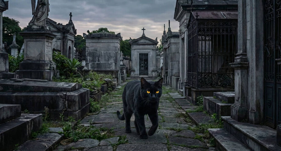 No coração do Cemitério do Paquetá, fundado em 1854, uma sombra elegante e silenciosa costuma desafiar a lógica: o famoso Gato Preto.