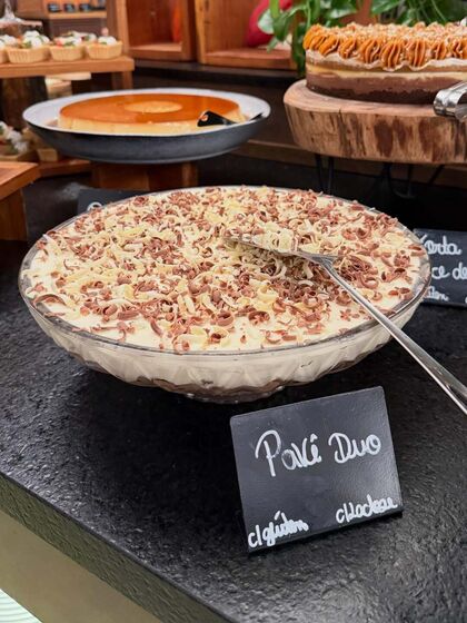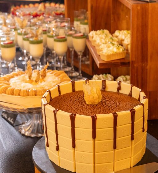A imersão começa na decoração, com direito a lustres que imitam gotas de chocolate escorrendo, e termina no prato. O sistema de pensão completa inclui refeições fartas, mas a grande atração está nas sobremesas.