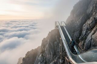 Nova atração em Lingshan transforma o alpinismo tradicional em uma experiência panorâmica com escadas rolantes que levam visitantes ao topo de 1.500 metros sem esforço