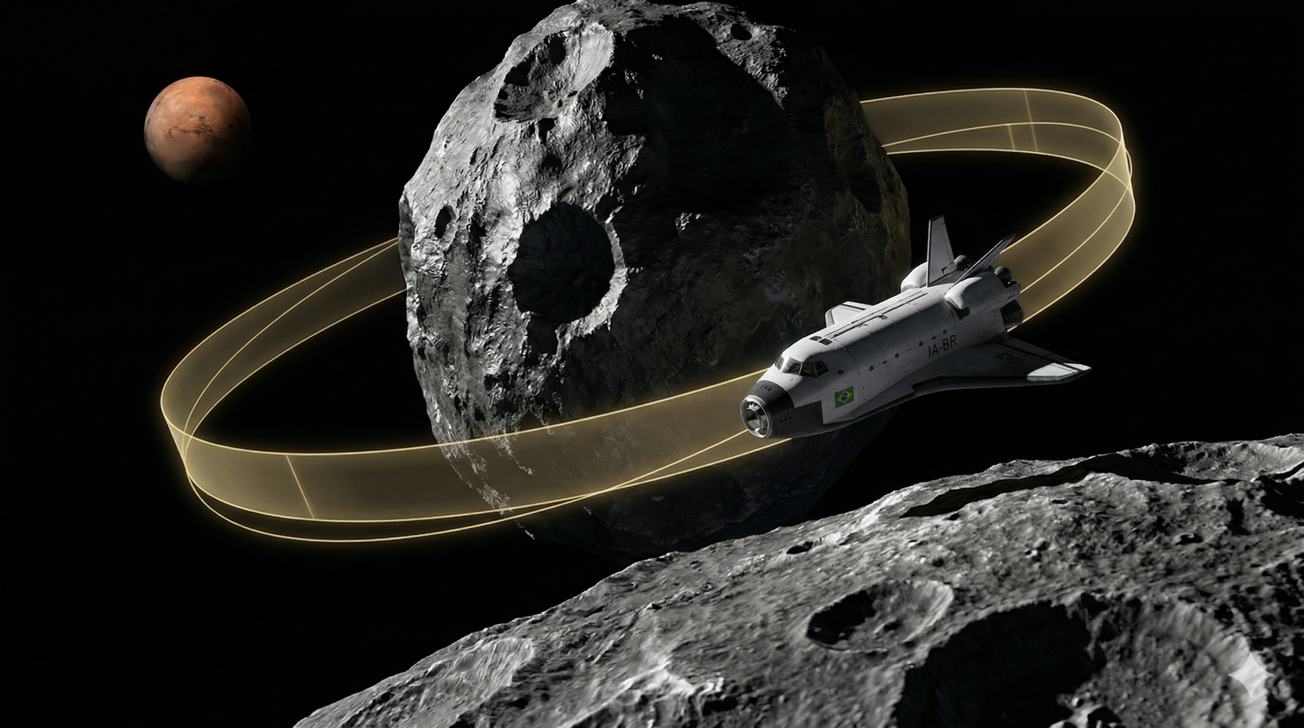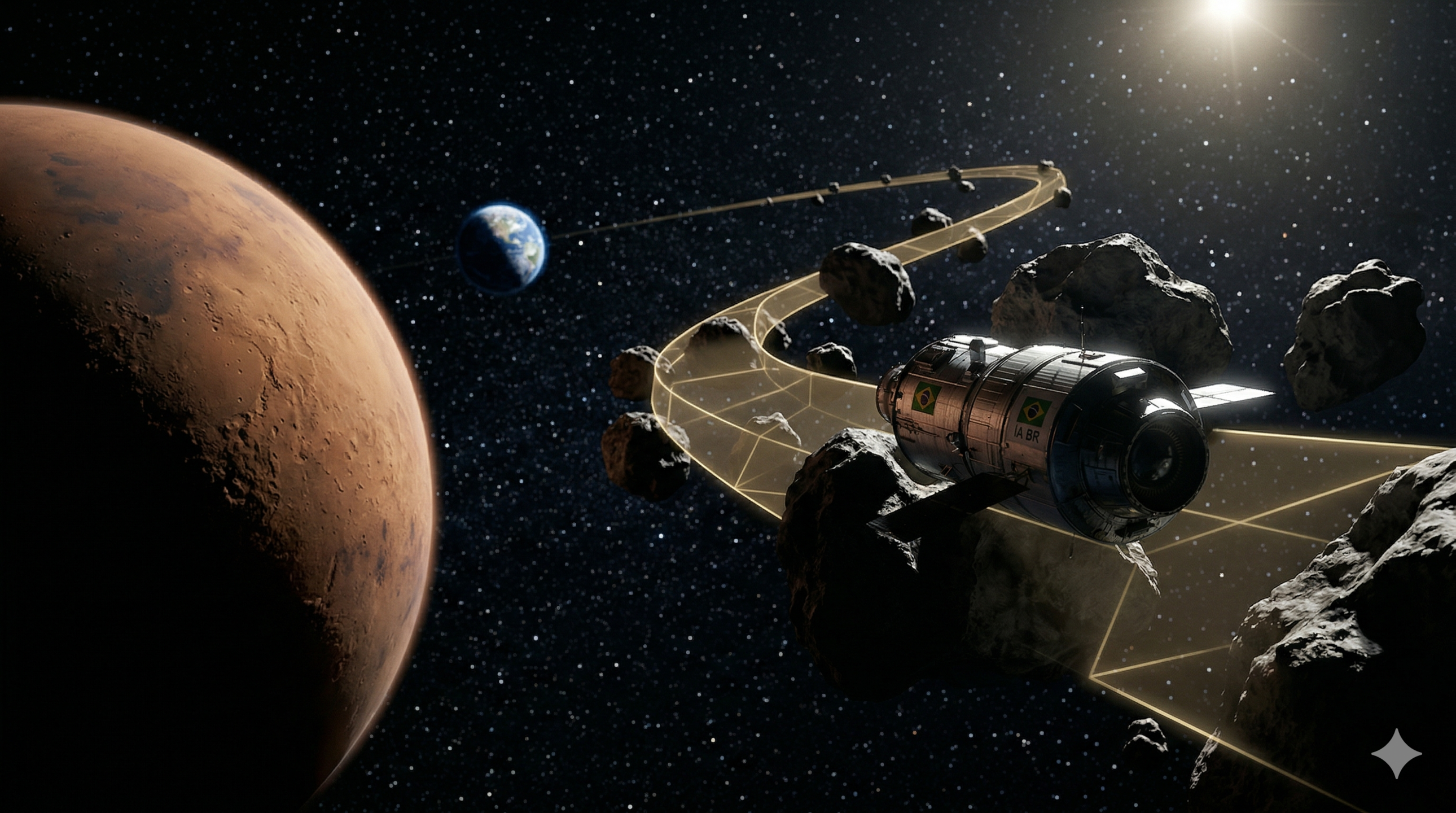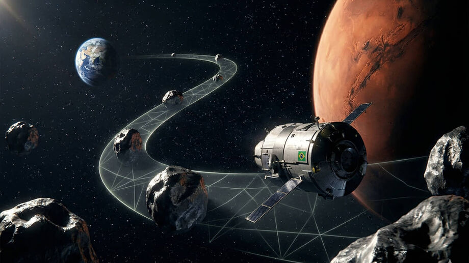 Imagem conceitual gerada por IA ilustra a nova rota brasileira para Marte em 153 dias, utilizando asteroides como 'estilingues' gravitacionais e validada por inteligência artificial / Imagem ilustrativa/IA/Gemini
