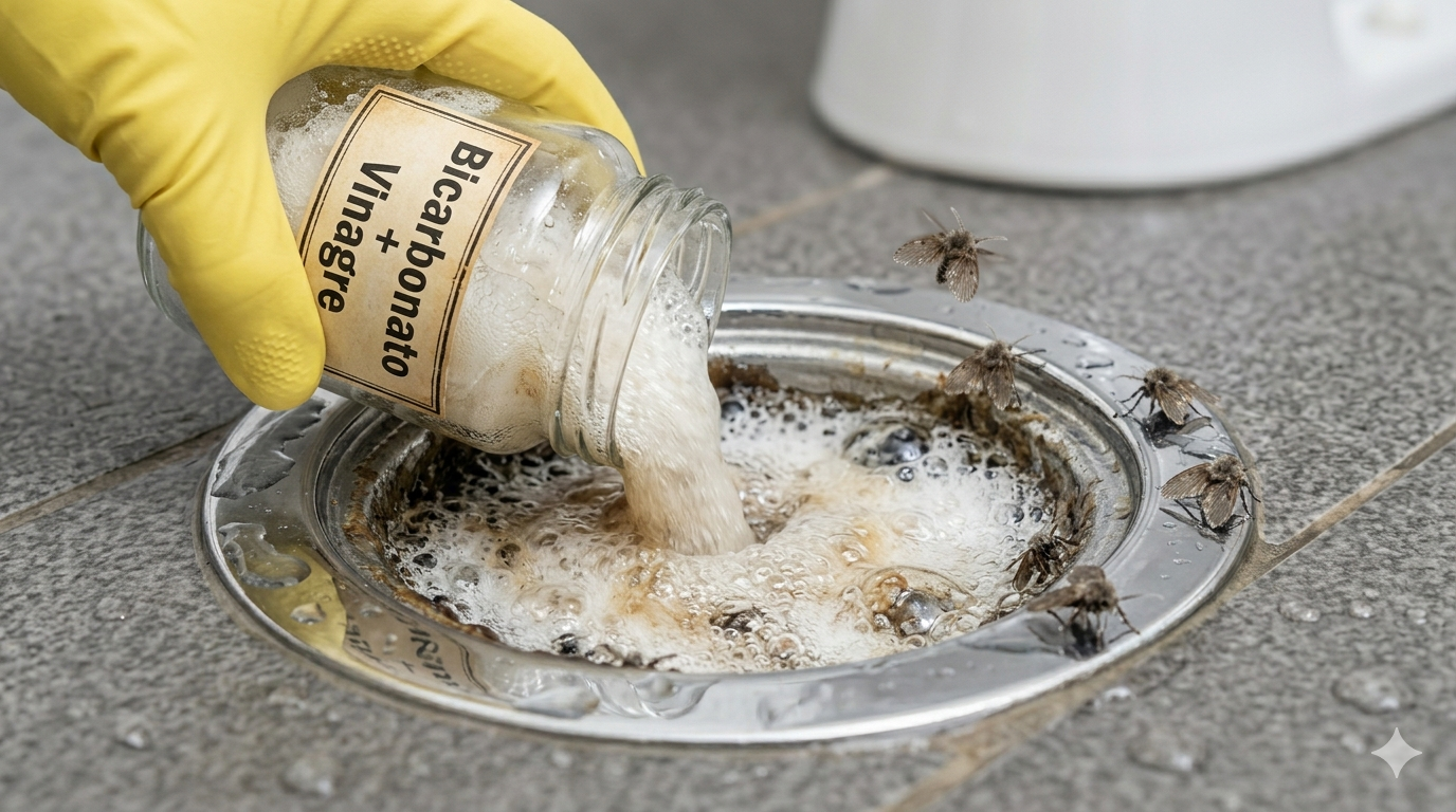 A mistura entre o bicarbonato de sódio e o vinagre ajuda a acabar com esses "ninhos" de insetos no banheiro - Imagem ilustrativa criada por IASe você já gastou meio tubo de inseticida tentando acabar com essas mosquinhas, já percebeu que no dia seguinte elas voltam com tudo. O motivo é biológico: o aerossol mata apenas o inseto adulto, que tem uma vida curta (cerca de duas semanas).