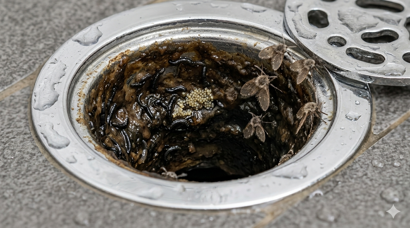 O verdadeiro problema está onde você não enxerga: nas larvas. Elas ficam protegidas por uma película de gordura e lodo dentro do cano do ralo. Enquanto você não quebrar essa barreira física, novas moscas vão continuar nascendo todos os dias.