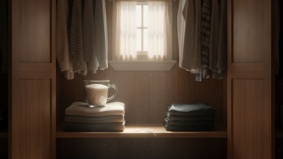 Truque das avós contra a umidade faz sucesso, um simples copo de arroz dentro do armário tira o cheiro de guardado das roupas / Gerada por IA/Gemini