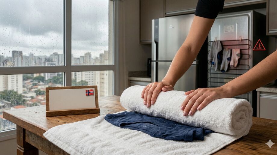 Mas quem não possui uma secadora em casa sabe o desespero que é precisar de uma peça de roupa em dias de chuva / Canva/NDA técnica norueguesa exige apenas um item que você já tem em casa: uma toalha seca e limpa. Ela é ideal para secar roupas rapidamente em regiões úmidas ou frias, sendo muito útil em situações emergenciais.