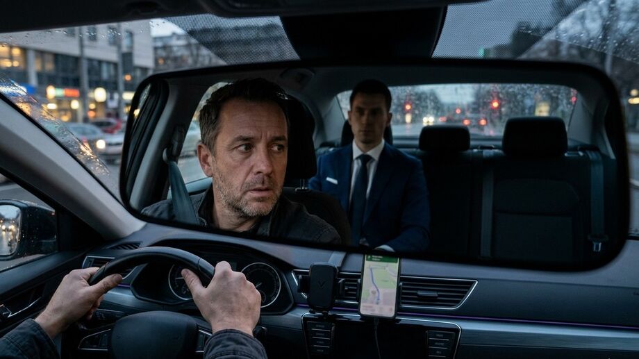 Alejandro observa o misterioso passageiro de terno azul em seu banco traseiro / Imagem ilustrativa criada com IA