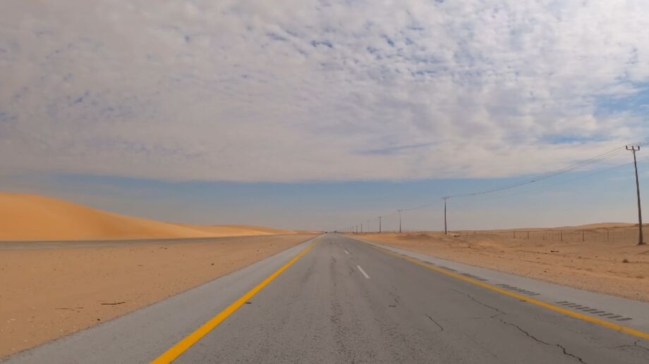 A rodovia atravessa o Rub' al Khali, chamado de Quarto Vazio e reconhecido como o maior deserto de areia do mundo. Dunas extensas dominam a paisagem.