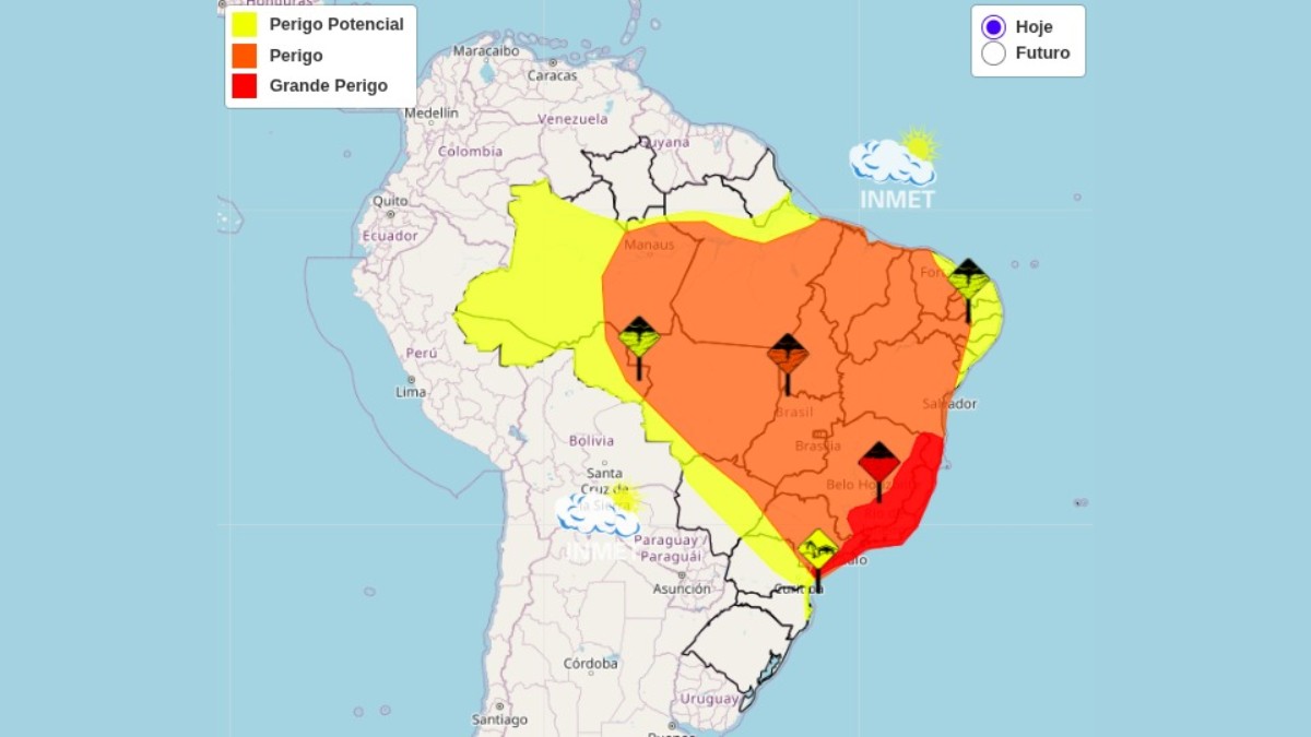 Divulgado pelo Inmet, o mapa representa as regiões com maiores ou menores perigos de chuvas intensas. Reprodução/InmetObserve que a região está localizada em uma área vermelha. A cor mais intensa representa maiores perigos, enquanto outras cores menos destacadas - como laranja e amarelo -, mostram cenários menos alertantes.