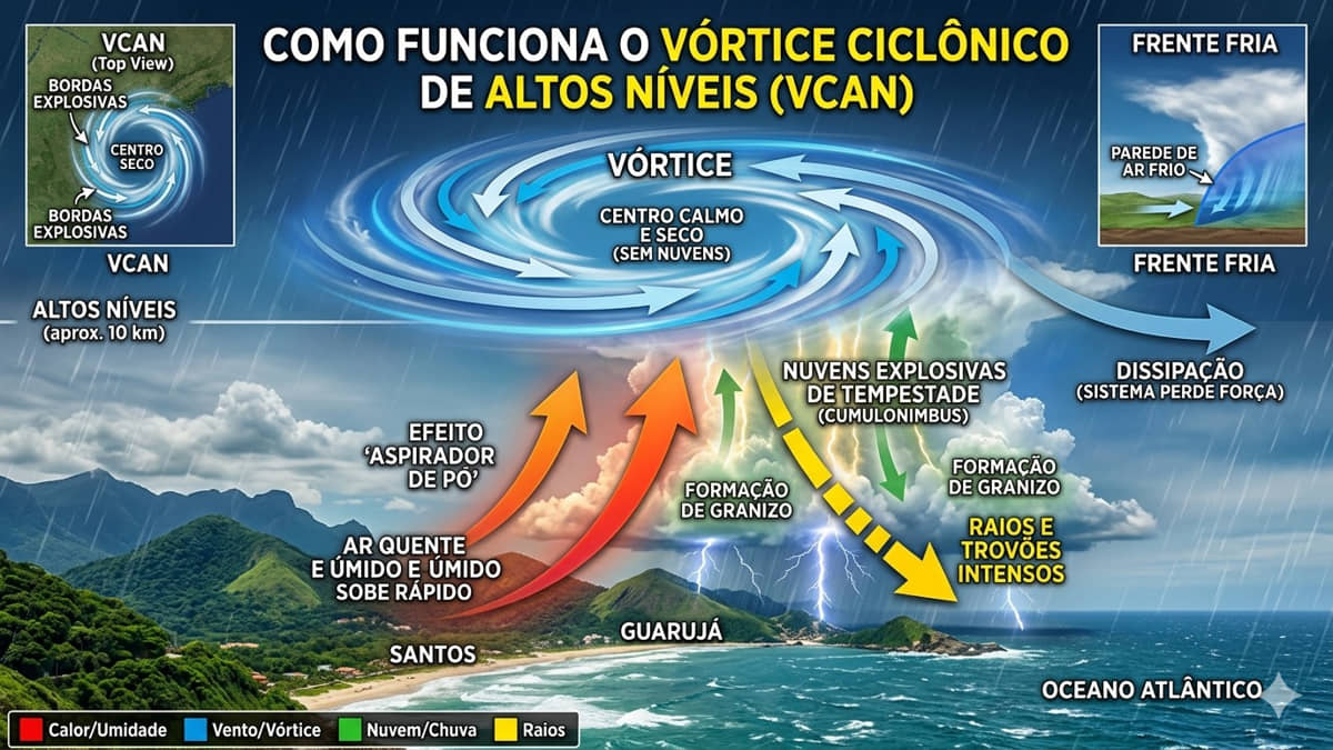 Esse "redemoinho" funciona como um aspirador potente: ele puxa todo o calor e a umidade que estavam parados aqui no litoral e os joga para o alto com muita velocidade. Quando esse ar quente sobe rápido demais e encontra o ar gelado lá de cima, o choque é violento.