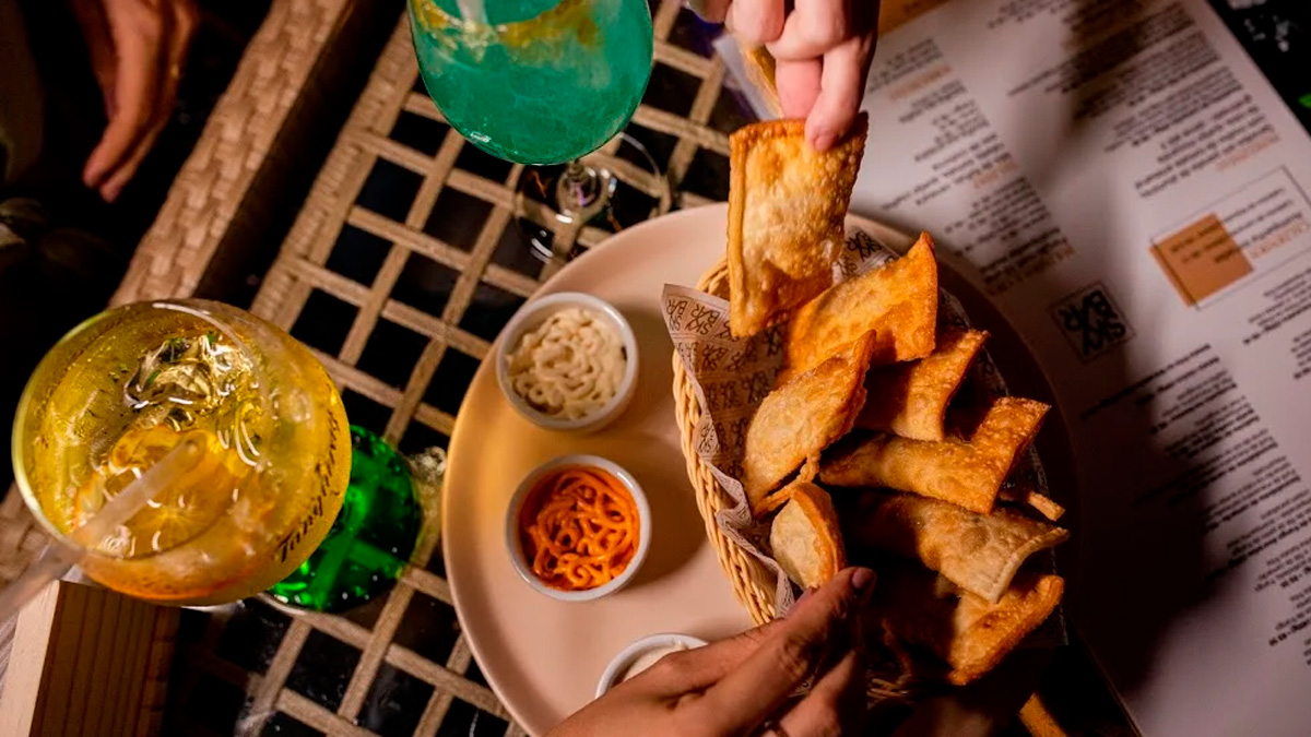 O ambiente combina mesas internas e externas, além de lounges e sofás na varanda, opções mais exclusivas que podem ser reservadas no local mediante pagamento adicional. O cardápio também é um destaque, com pratos e drinks coloridos que reforçam a proposta visual e descontraída do espaço.