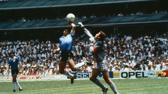 Maradona concedeu um dos momentos mais icônicos da história do esporte. Diante da Inglaterra pela quartas de final, o craque argentino tirou um coelho da cartola ao usar a mão para marcar o gol aos 6 minutos do segundo tempo, condecorando o momento como ‘Lá Mano de Dios’.