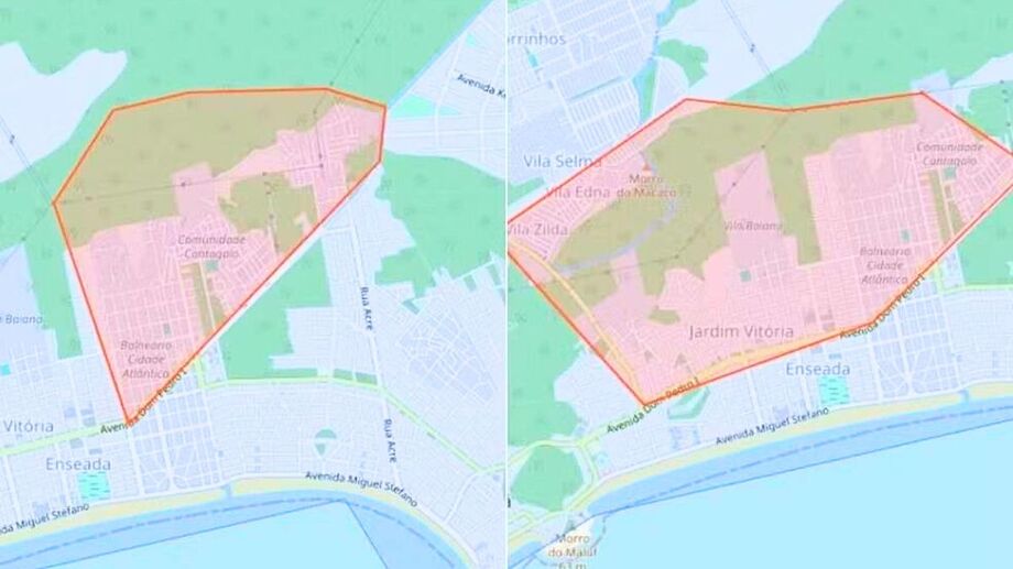 A Defesa Civil Estadual divulgou mapas com áreas de risco de deslizamento na região da Barreira do João Guarda (à esq.) e da Vila Baiana (à dir.) / Divulgação/Defesa Civil