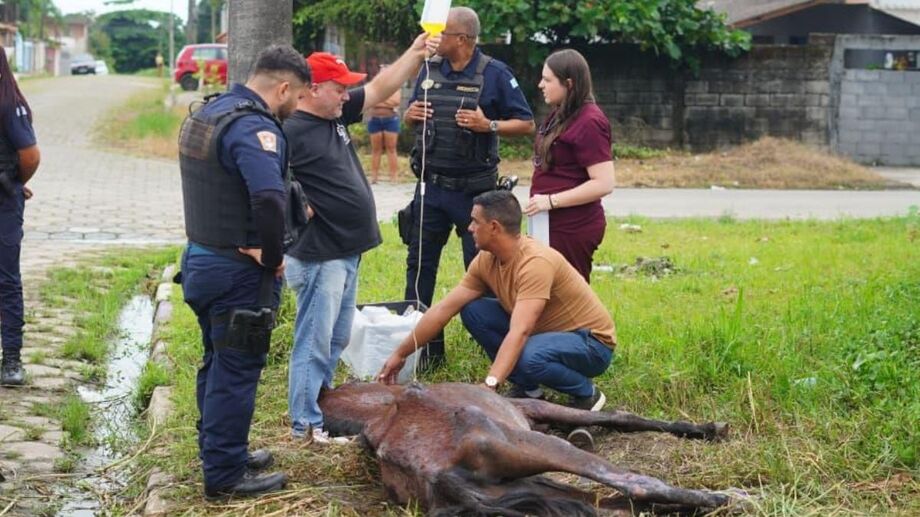 Foram realizados procedimentos emergenciais, como fluidoterapia intravenosa e aplicação de vitaminas, para estabilização. Com ajuda de moradores, o cavalo foi colocado de pé.