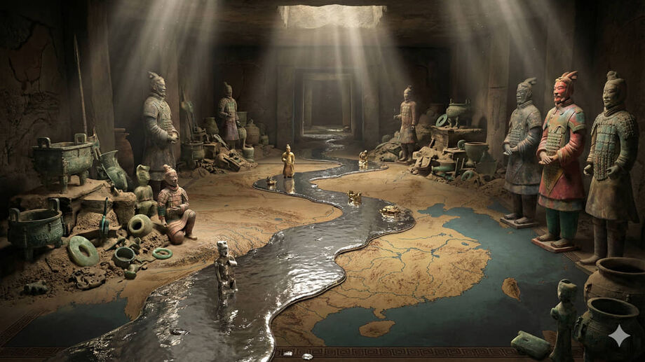 Simulação mostra os lendários rios de mercúrio no túmulo selado / Imagem ilustrativa gerada por IA/DL