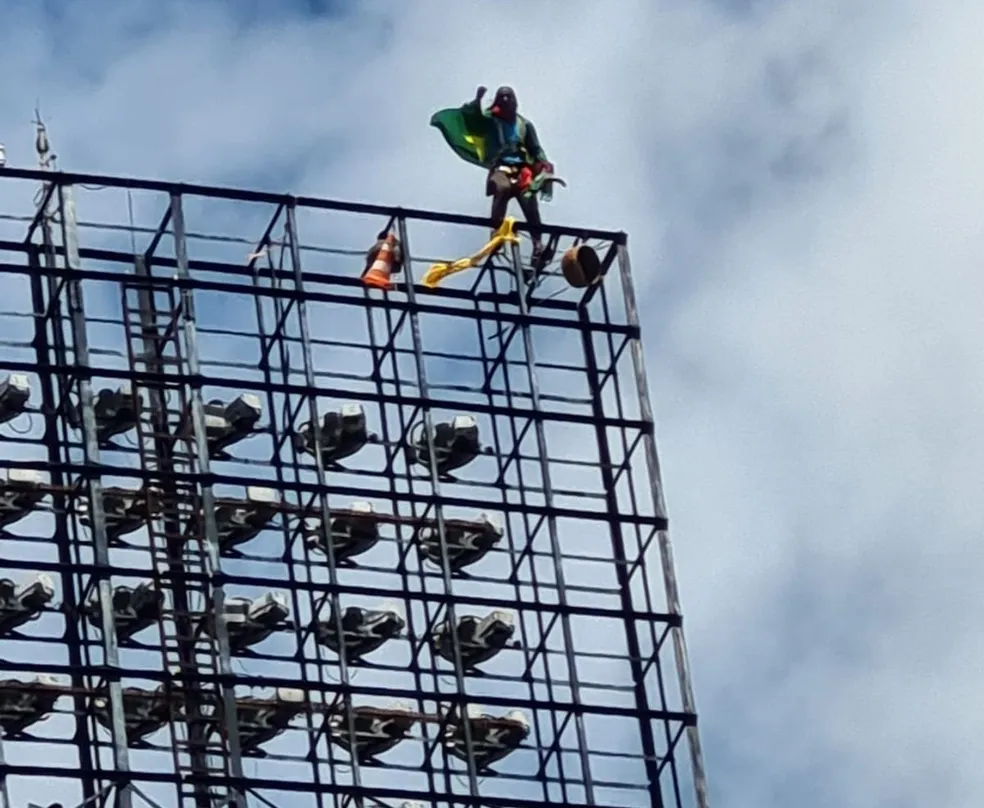 De acordo com os bombeiros, o homem subiu na estrutura “em forma de protesto” e teve que ser convencido pela equipe a descer do local. O resgate contou com a mobilização de uma força-tarefa.
